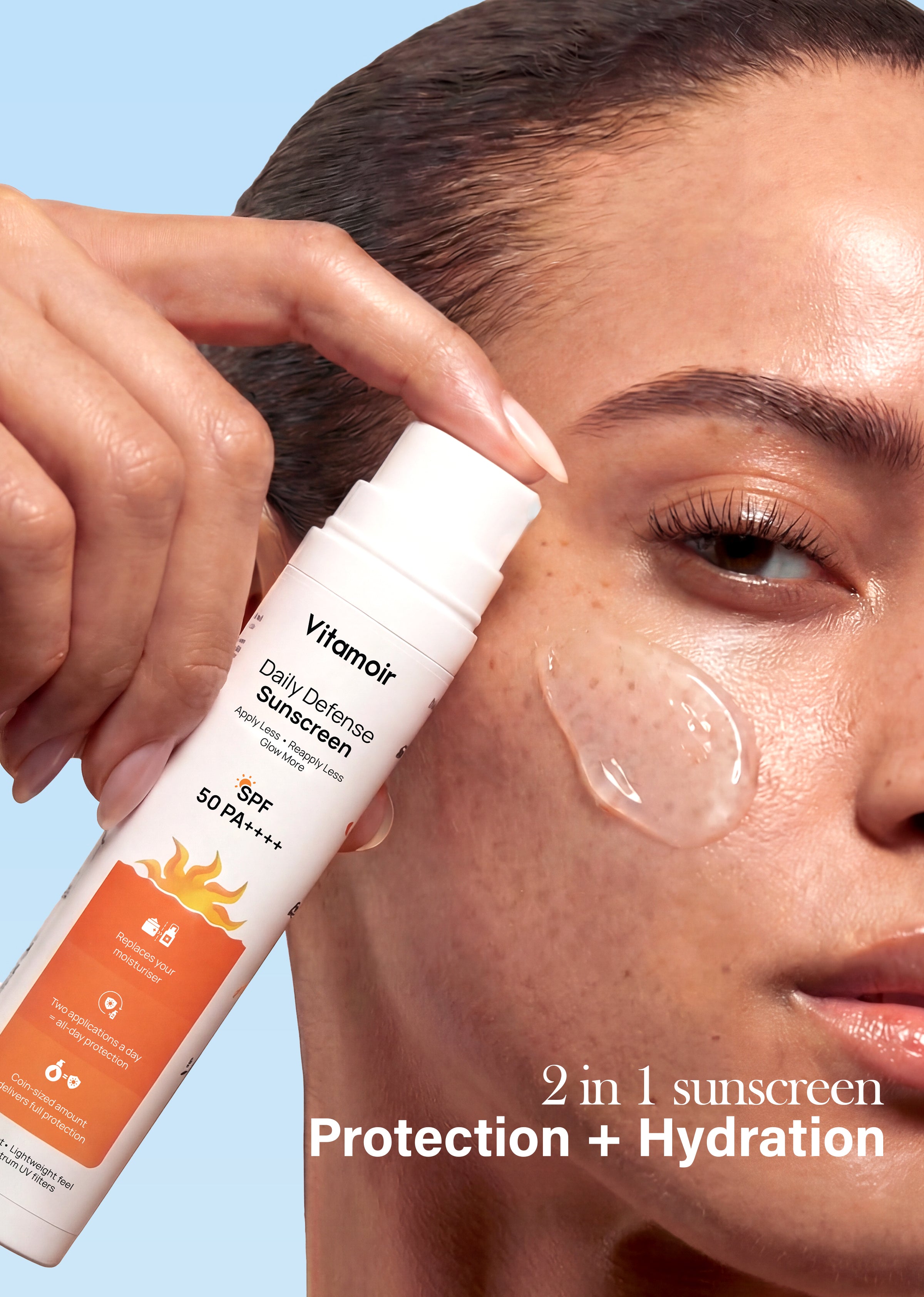 Our SPF 50 PA++++ Sunscreen + Moisturizer shields, hydrates, and brightens — all in one effortless step. Lightweight, no white cast, and designed to feel like your own skin.